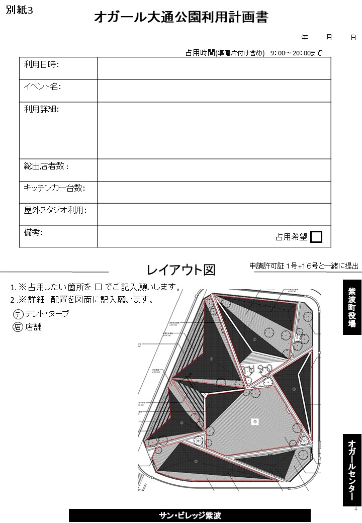 ※イベント利用時、「交流公園占用許可申請書」・「交流公園行為許可申請書」を記入していただき、イベント5日前までに交流館事務局に提出お願いします。