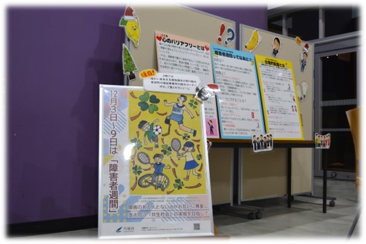 12月16日から18日まで、2階市民ギャラリーにおいて「障がい者週間 パネル展示」が開催されました。障害者週間に合わせ、障がい福祉に関するパネルと町内の障がい福祉事業所等の紹介パネルが掲示されました。